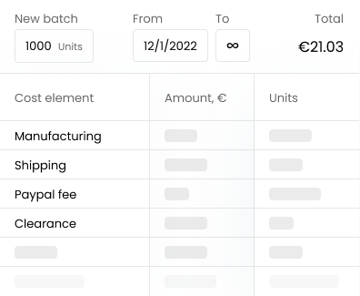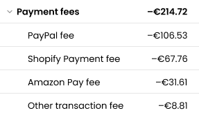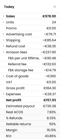 Lass dir eine detaillierte Liste aller wichtigen KPIs für dein Unternehmen anzeigen, einschließlich Umsatz, Einheiten, Werbe- und Versandkosten, Zahlungsgebühren, Umsatzkosten, indirekte Kosten, Brutto- und Nettogewinn und vieles mehr!