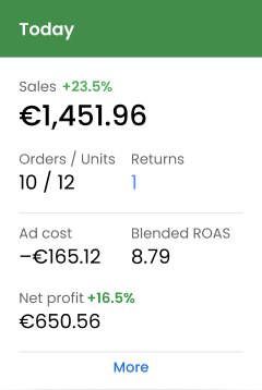 Mit nur einem Blick bekommst du ein umfassenden Überblick über die Verkäufe, Bestellungen, Retoure, Werbekosten, den gemischten ROAS und den Nettogewinn deines Unternehmens, indem du die "Übersicht" nutzt. Vergleiche schnell die Performance deines Unternehmens und identifiziere Bereiche mit Verbesserungspotenzial.
